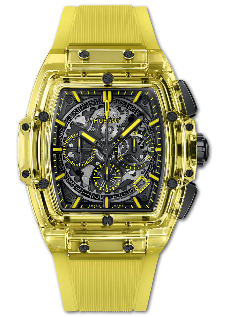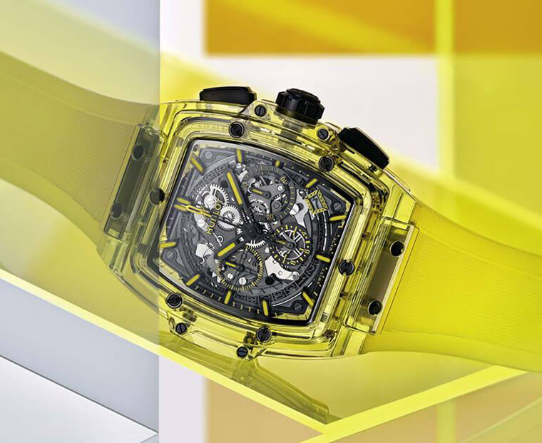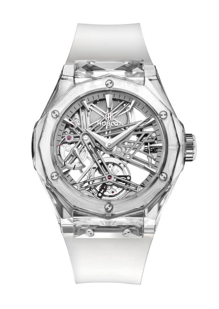 藍寶石水晶材質/HUB 4700自動上鍊機芯/時、分、小秒、日期顯示/計時碼錶功能/藍寶石水晶鏡面、透明底蓋/防水100米/錶徑42mm/限量100只/參考價:NT$ 3,270,000