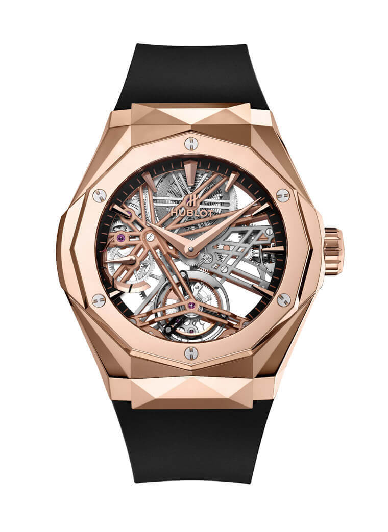 18K皇金材質/HUB 6021手動上鍊機芯/時、分顯示/陀飛輪裝置/動力儲存顯示/藍寶石水晶鏡面、透明底蓋/防水30米/錶徑45mm/限量30只/參考價:NT$ 3,107,000