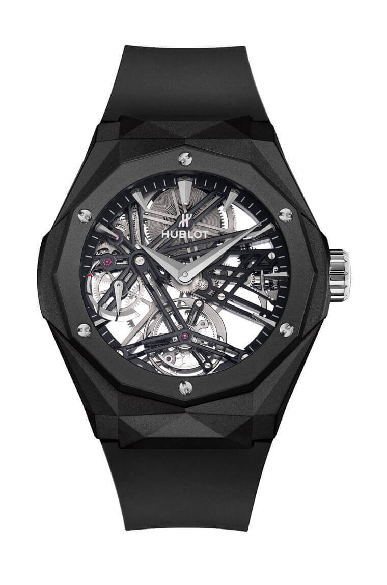 黑色陶瓷材質/HUB 6021手動上鍊機芯/時、分顯示/陀飛輪裝置/動力儲存顯示/藍寶石水晶鏡面、透明底蓋/防水30米/錶徑45mm/限量30只/參考價:NT$ 2,780,000