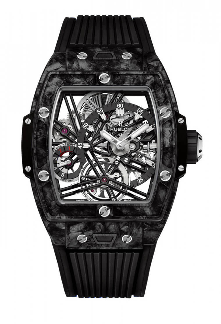 黑色碳纖維材質/HUB6020自動上鍊機芯/時、分顯示/陀飛輪裝置/動力儲存顯示/藍寶石水晶鏡面、透明底蓋/防水30米/錶徑42mm/限量100只/參考價:NT$ 2,943,000