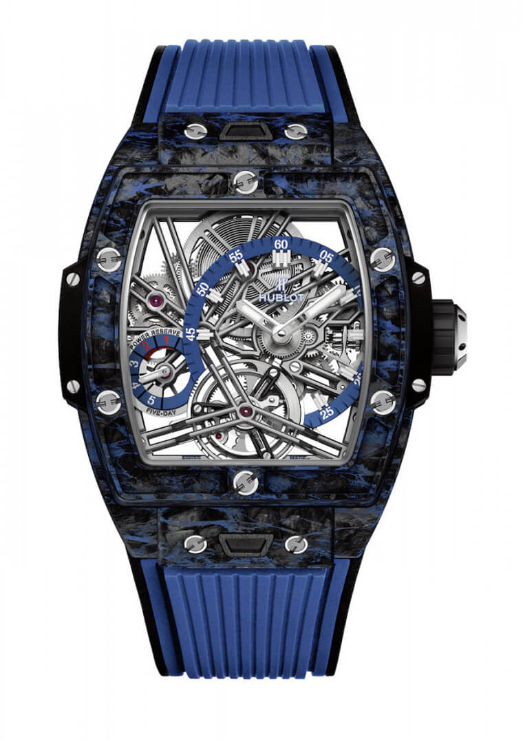 藍色碳纖維材質/HUB6020自動上鍊機芯/時、分顯示/陀飛輪裝置/動力儲存顯示/藍寶石水晶鏡面、透明底蓋/防水30米/錶徑42mm/限量100只/參考價:NT$ 2,943,000