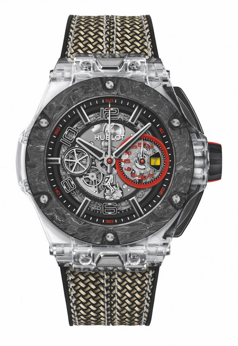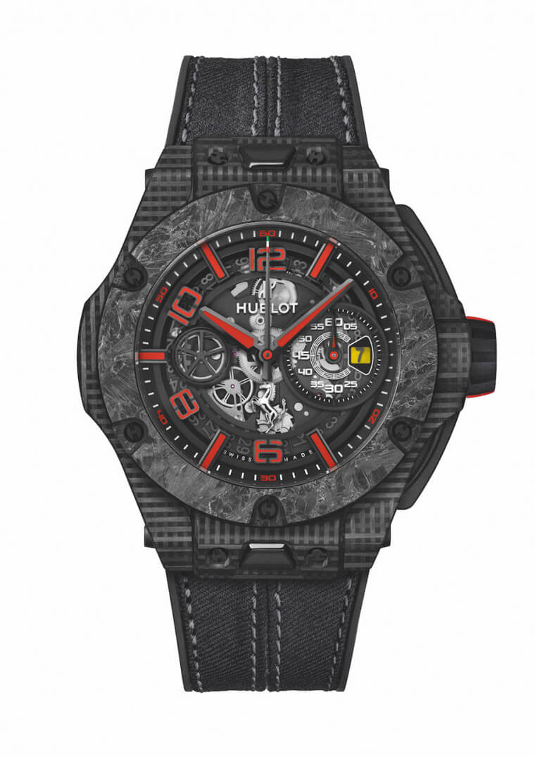 3D碳纖維材質/HUB1280自動上鍊機芯/時、分、小秒、日期顯示/計時碼錶功能/藍寶石水晶鏡面/防水100米/錶徑45mm/限量500只/參考價:NT$ 847,000