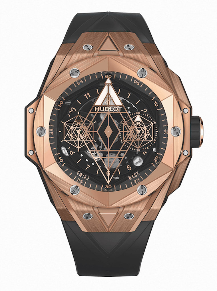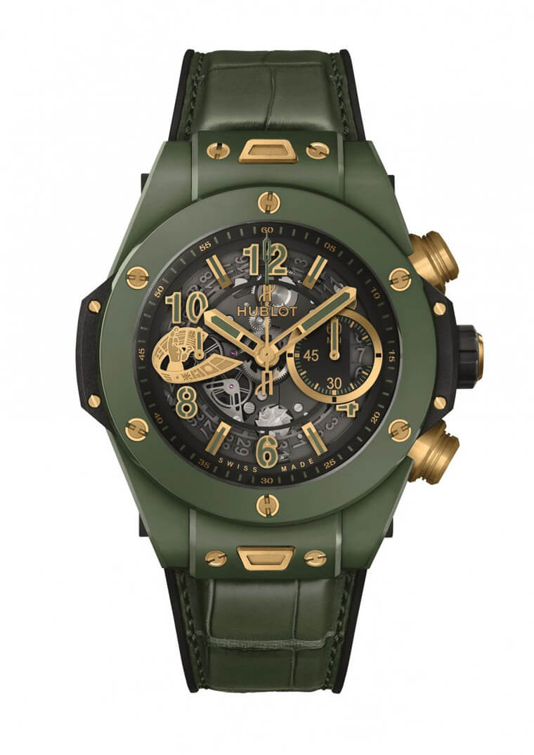 18K黃金材質、陶瓷錶圈/HUB1242自動上鍊機芯/時、分、秒、顯示/計時碼錶功能/藍寶石水晶鏡面/防水100米/錶徑45mm/限量50只/參考價:NT$ 1,270,000