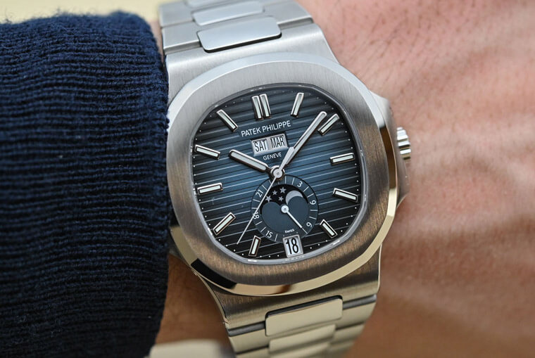 ▲Nautilus年曆錶不鏽鋼款的面盤從原本的黑色或白色改成了漸層藍色,呼應了系列最初的配色,也讓原本鍊帶的兩色面盤就此走入歷史。