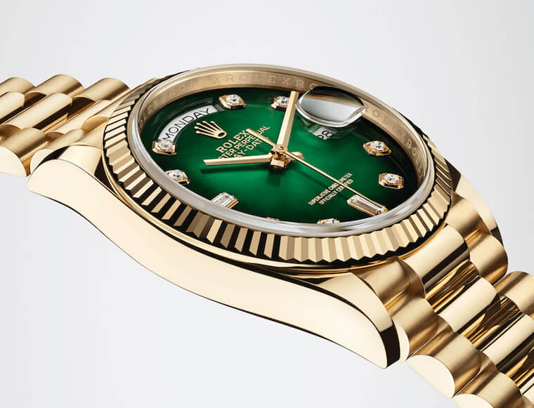 2019年勞力士一次推出了五款全新Oyster Perpetual Day-Date 36, 主要為黃金款、白色黃金款及永恒玫瑰金款,但均搭配獨特新錶面,且部分新款搭配鑲鑽外圈。其中這款為黃金款搭配漸變綠色面盤,並綴以18ct金鑲鑽時標,6點鐘及9點鐘位置鑲嵌2顆方形鑽石,此乃Day-Date 系列特有設計。錶款搭載品牌新生代的3255機芯,這也是Oyster Perpetual Day-Date 36首次搭載此款機芯。機芯配備恒動自動上鍊組件,藉由恒動自動盤為機芯上鍊。 發條盒的結構與擒縱系統的優秀效率,使 3255機芯的動力儲備增至約70 小時。