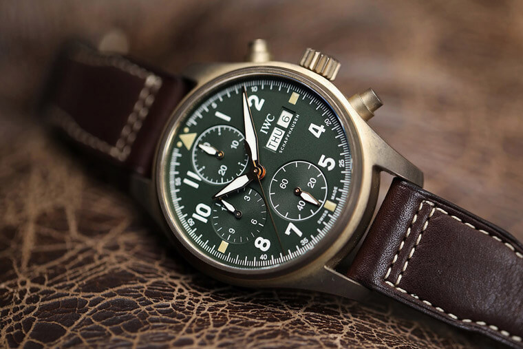 新款IWC噴火戰機系列青銅錶有幾個共同特徵,除了剛出廠的錶殼都帶有一致的青銅溫潤色調,它們還一律採用橄欖綠色面盤並搭配棕色的小牛皮錶帶,這樣的配置並非偶然,綠面未來能與銅鏽的色澤內外呼應,棕色錶帶的暖色系在長期佩戴後也能像錶殼般留下一些歲月的痕跡,以上都能確保噴火戰機系列青銅錶愈戴愈有味道。而在面盤配置上,這款跟品牌飛行員系列中的其他計時碼錶相去不遠,例如它配置了左三眼錶盤格局,另在3點方向同時設有日期、星期窗,讓佩戴者可以獲得的時間資訊更充足,同時IWC飛行錶招牌的12點方向三角時標也依舊高掛在原地。圖片:swisswatchesblog.de