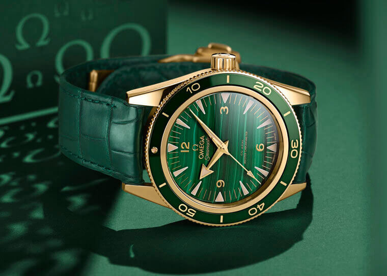 這款的黃金錶殼直徑有41mm,剛好是個介於正裝錶和運動錶的微妙尺寸,不過對亞洲男性而言其實也算是很剛好的大小,而包括錶殼造型、錶圈材質、時標與指針造型等,新款的黃金海馬300米與去年那款幾乎完全一樣,不過值得注意的是,2019年版的3、6、9、12點鐘時標和12點與6點方向的品牌Logo以及同軸擒縱、大師天文台認證等字樣一律從白色改為綠色,從這個小細節中可以區辨出前後兩個版本的差異。此外去年的綠色孔雀石面盤本身的紋路比較偏向不規則型,到了今年的孔雀石面盤則變為帶有深淺色調的水平紋路,或許是因為採用的孔雀石本身紋路的關係,造就前後兩款黃金海馬300手錶視覺上的區隔。