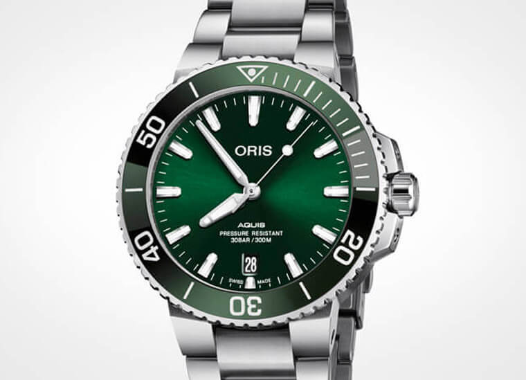 ORIS Aquis 39.5mm潛水錶採用不鏽鋼材質,錶圈升級為陶瓷材質有助於提升表面的防刮性以及視覺美感,綠面對潛水錶來說一項是個指標(畢竟R牌的水鬼光環實在太亮眼),因此帶有類似錶面顏色的潛水錶總是更能引起我們的目光,當然綠面潛水錶不是R牌的專利,各家製作上也會各有各的特色或賣點,Aquis的特色設計如錶圈上的12點方向設有一個倒三角形加圓點標記,另外時標以及指針的造型帶有立體感也塗覆了夜光物料強化夜間判讀的清晰度,另外「棒棒糖式」秒針的設計也很有辨識度,加上帶有放射紋效果的面盤修飾,使得Aquis潛水錶的綠面綠得很有層次,而且陶瓷圈強調永不褪色的優點,這也會讓手錶戴久了比較不會有明顯的歲月痕跡。