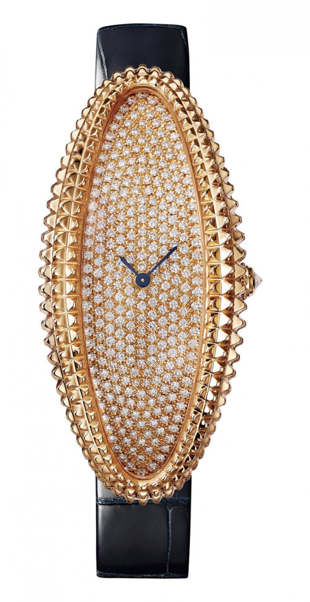 另一方面,Baignoire Allongée在2019年也有新成員加入,系列狹長尖銳的橢圓造型完整保留,新款不僅推出錶殼、面盤鑲鑽的奢華版本,更首見於錶殼增添巴黎飾釘的最新進化款式——錶殼覆滿金字塔狀的飾釘,無論在觸感或是視覺效果上皆展現出有別於拋光或鑲鑽等形式的新意,這同時也顯示出卡地亞的外裝製作工藝隨著時代而迭有進化,正如同Baignoire Allongée當初誕生的時代背景,不受傳統拘束、積極展現自我正是它長期以來累積自身人氣的祕訣。