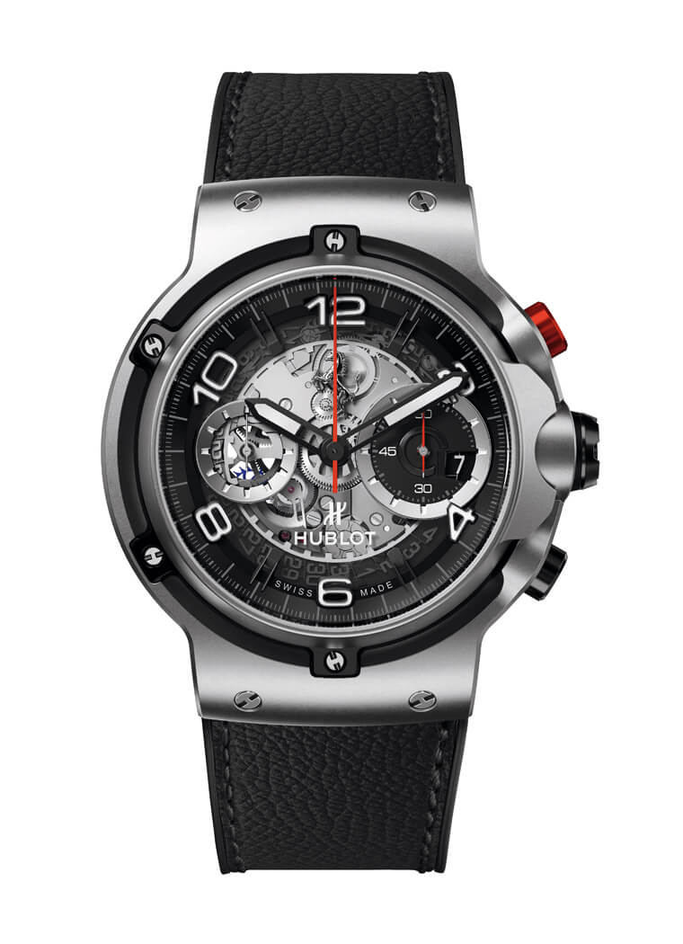 鈦金屬材質/Unico HUB1280自動上鍊機芯/時、分、小秒、日期顯示/飛返計時碼錶功能/藍寶石水晶鏡面、透明底蓋/防水100米/錶徑45mm/參考價:NT$ 684,000
