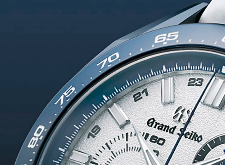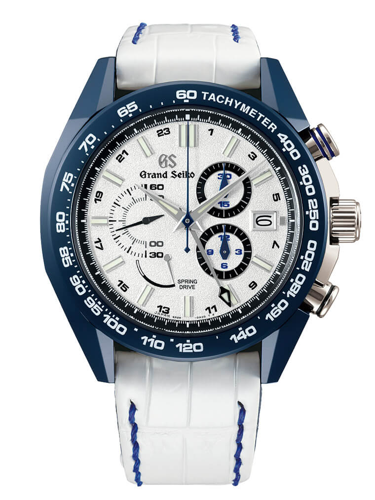 為了要在錶款上重現這樣的塗裝,GS選擇了這兩年賣得很好的陶瓷運動款,將錶款的配色換成了藍色陶瓷的外殼、錶圈搭配白面與白色皮帶,如此一來在整體的構圖中,藍陶瓷的部分就相當於車身,從面盤延續到錶帶的白色就成了箭頭。細節的部分還有一連串的修改,首先它將原本錶圈上的24小時數字換成了測速刻度,呼應賽車的主題,而原有的24小時數字則印到了面盤邊緣;面盤加入了顆粒的梨地紋,除此之外右半邊兩個計時用的小盤以及主盤面的最外圍都採用了黑圈,同樣是充滿了競賽計時器風格的元素。
