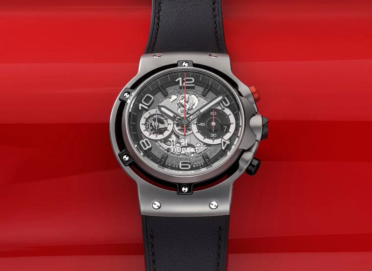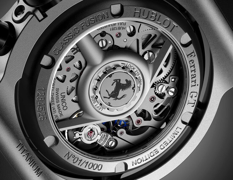 錶款搭載了2018年剛推出的小徑版Unico機芯HUB1280,從這裡可以嗅出小型化的意圖;45.00mm的錶徑或許很難稱得上「小」,但相對於13.15mm的厚度卻意外地顯得相當纖薄,再加上錶耳往下彎曲的弧度夠大,實際配戴起來就算是亞洲人的手腕也相當服貼,足見HUBLOT和法拉利兩造對於GT這個主題真的抓得很緊,以結果來說確實創造出了一款有別於Big Bang的日用版法拉利錶。