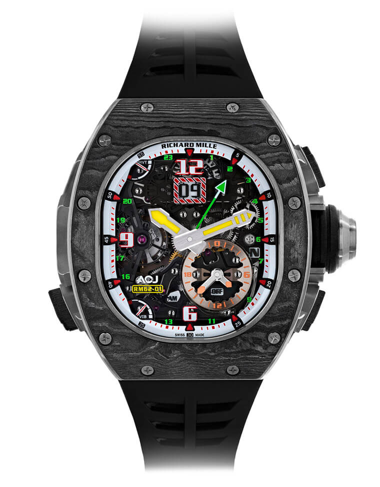 傳統上,腕錶的鬧鈴功能,經常是透過音錘敲擊柱子、鑼等由內部發出的聲音,來提醒佩戴者時間,這些都是透過「發出聲響」的方式,然而,一向以前衛創新見長的RICHARD MILLE卻一舉大膽挑戰了這個對於鬧鈴錶的慣常思考模式,成就了一款腕上傑作——RM 62-01 ACJ 。