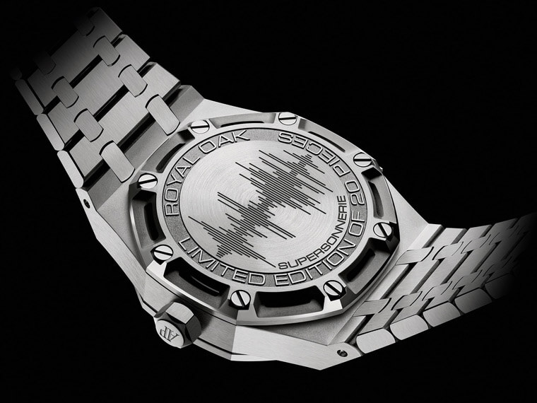 翻到錶背會看到愛彼超問錶專屬的音頻圖實底蓋,從這部分可以窺見其有別於一般問錶的線索,錶款所搭載的2959機芯在結構上有不同之處,音簧附著在機芯下面,並與特製傳導材質共組猶如吉他內部共鳴箱的裝置,所以這讓它的報時音效更被放大,聽起來宏亮悅耳,再者愛彼針對報時機制的結構也作出調整,與傳統問錶的差異在於,在未滿刻鐘的情況下,問錶敲擊小時和分鐘之間的聲響不會出現明顯的空白,讓報時音效總是自然而流暢的;此外由於問錶機芯結構複雜,一旦操作不慎可能造成機芯零件出現損毀,為此愛彼也替報時機制設計了保護裝置,因此當問錶啟動時,如果佩戴者不小心拉出錶冠想要調時間並不會對機芯造成影響,確保腕錶的耐用度得以提升。這款猶如經過2019年GPHG雙獎項綜合體的皇家橡樹超問錶從底蓋上可以清楚看見限量20只的發行數量,突顯這種極致複雜手錶工藝的珍貴特性以及製作難度。