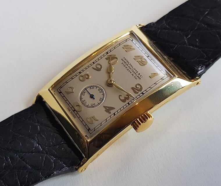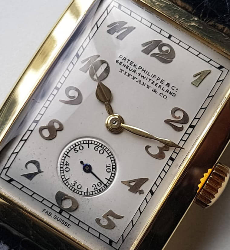 ▲燒青面盤,立體草寫阿拉伯字時標,桃形指針(皆為金質),軌道分刻度,當年由Tiffany銷售,是款古董好錶。估價港幣7萬8000千~16萬元。