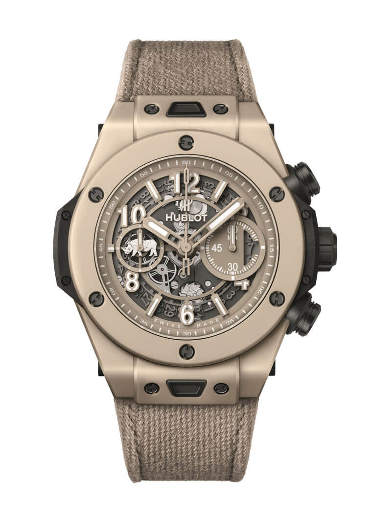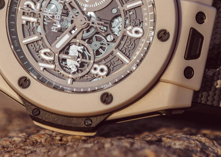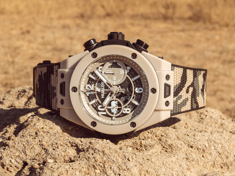 為了呈現這次特殊款所點到的野生動物或是沙漠這些主題,HUBLOT將標準的Big Bang Unico加入了卡其色和迷彩等等元素——當然像這些軍事元素這兩年原本就很熱門,不過HUBLOT在這裡又從他們家最拿手的材質方面切入,在技術上創造了跟其他類似產品不同的高度。