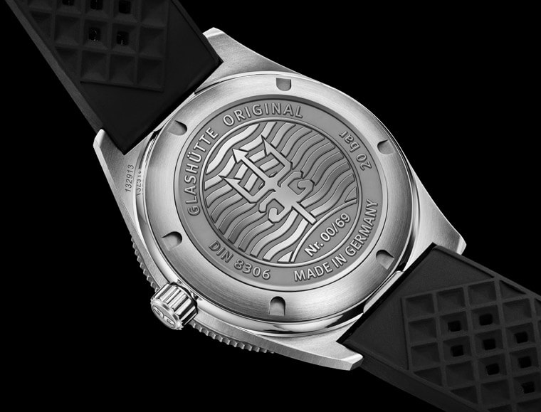 ▲SeaQ 1969和SeaQ的底蓋上均鐫刻海神武器三叉戟、格拉蘇蒂原創雙G標識以及20條波浪紋 (代表手錶防水性能20巴)。