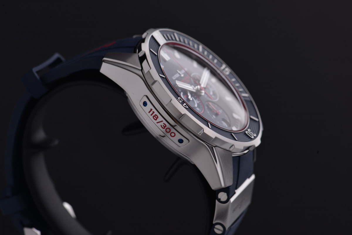 不鏽鋼材質/UN-150自動上鍊機芯/時、分、小秒、日、期顯示/計時碼錶功能/藍寶石水晶鏡面/防水300米/錶徑44mm/限量300只