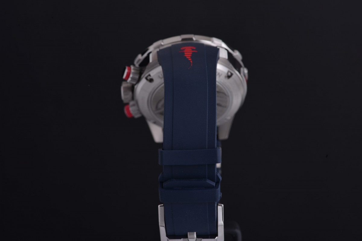 這只不鏽鋼款的潛水系列「紅色鎚頭鯊」限量錶相對於原先的設計來說,擁有了更多的細節:針扣上擁有容易識別的雅典錶標誌性的品牌名稱,錶殼側面的計時按把及錶冠都採用了紅色塗層進行處理,與整體的盤面設計、錶帶設計統一。三個小面盤依次排列的是:3點位的30分鐘計時盤、6點位的小時計時盤以及鑲嵌其中的日期顯示窗口、9點位的60秒計時盤。事實上,計時功能對於專業潛水錶而言至關重要,三個計時盤的加入為全新的潛水系列加入了更多的選擇。