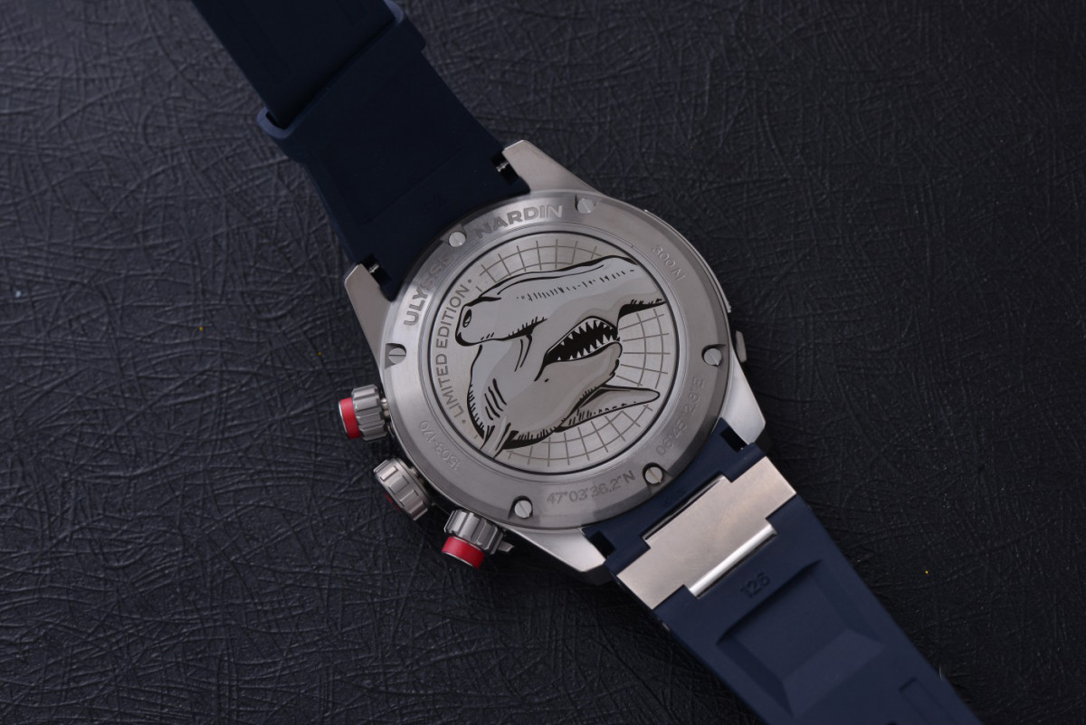 翻到手錶背面,可以看到底蓋上有一頭鎚頭鯊,在鯊魚張開的嘴巴後面雕刻了一種特殊的網格圖案,加強了這種動物的攻擊性,使其更具時尚感和陽剛感。此外,鯊魚現在是正面顯示,而不是側面,為一個大膽和更自信的外觀。秉承雅典表的鎚頭鯊傳統,該品牌已經開發了標誌性的藍色和紅色鎚頭版本數年了——這款新的計時記也採用了UN-150自動上鍊機芯,擁有了矽質擒縱裝置和48小時動力儲存。