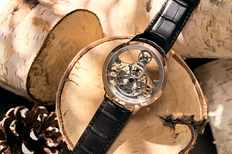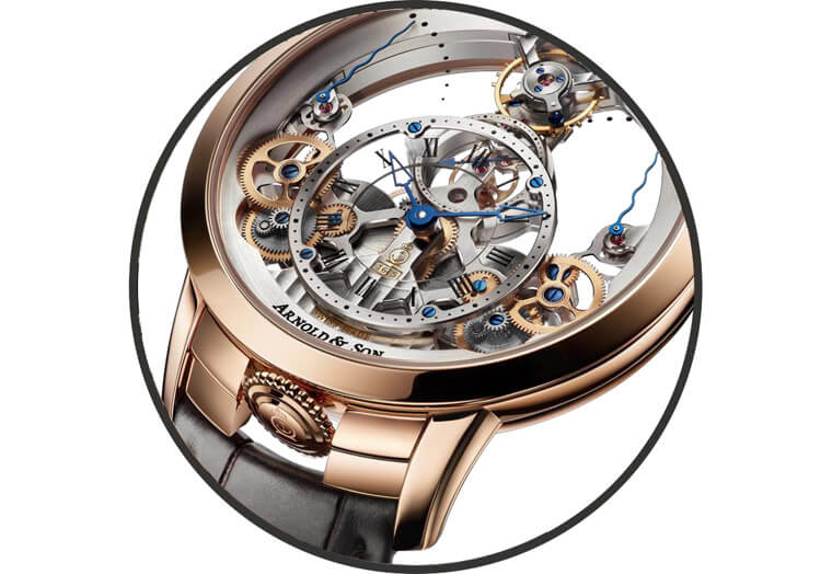 時間金字塔的視覺特徵與腕錶搭載的A&S1615機芯息息相關,這枚機芯的規格如27顆寶石軸承、擺輪震頻3Hz等,這些都算是中規中矩的高級機芯規格,然而A&S1615機芯的設計本身就很有辨識度,輪系從12點方向一路往下方延伸並展開,ARNOLD & SON致力維持對稱的美學,讓腕錶看起來工整而脈絡分明。A&S1615機芯除了排列方式和大範圍的鏤空之外,機芯零件和橋板等也都分別以緞面、砂面霧紋、日內瓦波紋或放射紋等加以修飾,而每枚零件的邊緣也都還會再經倒角拋光處理,連藍鋼螺絲螺帽表面也都有再經過拋光,因此賞玩時間金字塔腕錶時別只注意到鏤空、輪系連動的動態感,再靠近一點觀賞機芯零件的作工也會很有收穫,這也是高級製錶的精髓所在——高度手工製作比例,在不容易發現的細節處也絲毫不馬虎,在達到實際基本的精準走時要求之餘,時間金字塔展露出那種由豐富經驗所堆砌而成的紮實工藝水準,同樣是它受到收藏家青睞的一大關鍵。