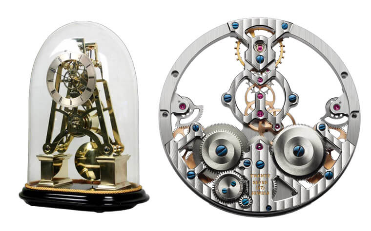 ▲機芯參考19世紀大不列顛鏤空座鐘(圖左)的設計,因而呈現上尖下寬的獨特金字塔造型,此外機芯零件與橋板的作工則是淋漓詮釋品牌累積上百年的深厚製錶底蘊。