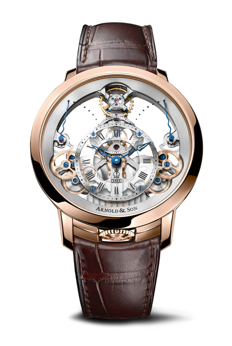 ARNOLD & SON在18世紀創立之際就是以製作精準航海鐘聞名的製錶品牌,因此他們旗下五大系列之一的Instrument儀表系列便是傳承並體現早期ARNOLD & SON製作高精密航海時計的血統。Instrument系列中的每款錶外型都很有自己的個性,其中Time Pyramid時間金字塔由於帶有大範圍的鏤空設計而相對顯得吸睛,這款錶一如錶名,鏤空的機芯結構在面盤內呈現猶如金字塔的上尖下寬造型,之所以會有如此特別的設計是因為ARNOLD & SON將品牌創辦人Arnold父子檔於19世紀三○~四○年代所創作的大不列顛鏤空座鐘當作設計藍本,這款當時被用作時間調校器的座鐘在拱形玻璃罩內部乘載了狀似金字塔造型的機械結構,跨越了三個世紀後,如今的時間金字塔腕錶將大不列顛鏤空座鐘的立體結構轉化為腕錶的平面化機芯排列結構,利用鏤空工藝與精心安排的機芯輪系結構,賦予腕錶自成一格的視覺魅力。