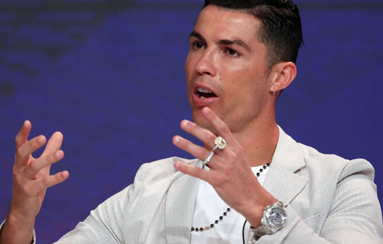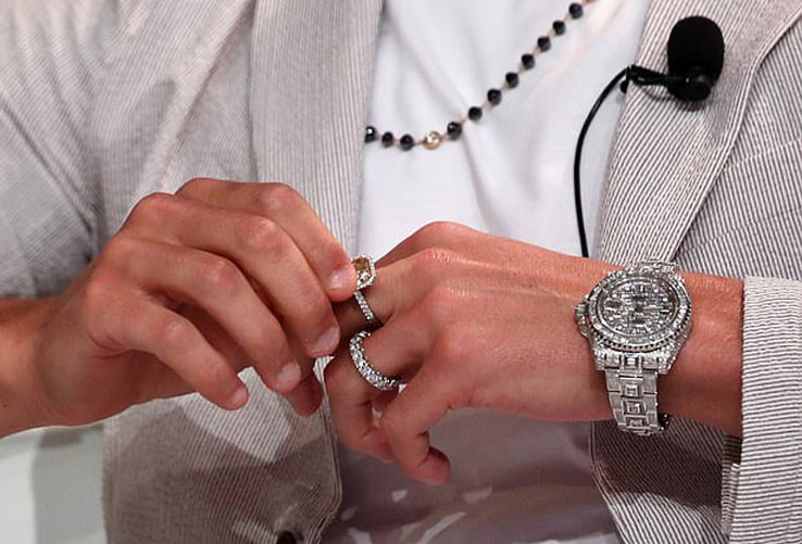 ▲C羅在論壇活動中除了戴了兩枚鑲滿鑽石的戒指之外,手上同時戴著的勞力士GMT-Master更是號稱目前勞力士市售款中最貴的款式。圖片:mirror.co.uk