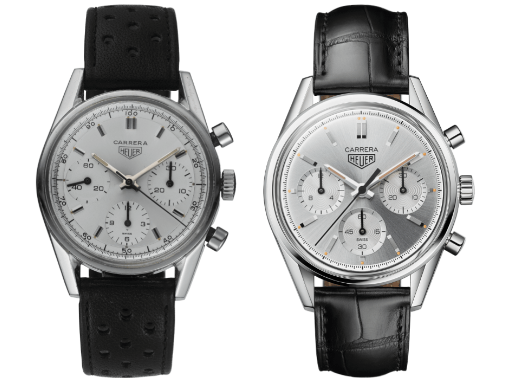 ▲1964年Heuer Carrera系列計時碼錶(左)採用著名的銀色錶面,搭載三個夜光計時器及銀色放射紋錶面,這樣的設計儼然成為了2020年推出的泰格豪雅160週年限量錶(右)的創作靈感。