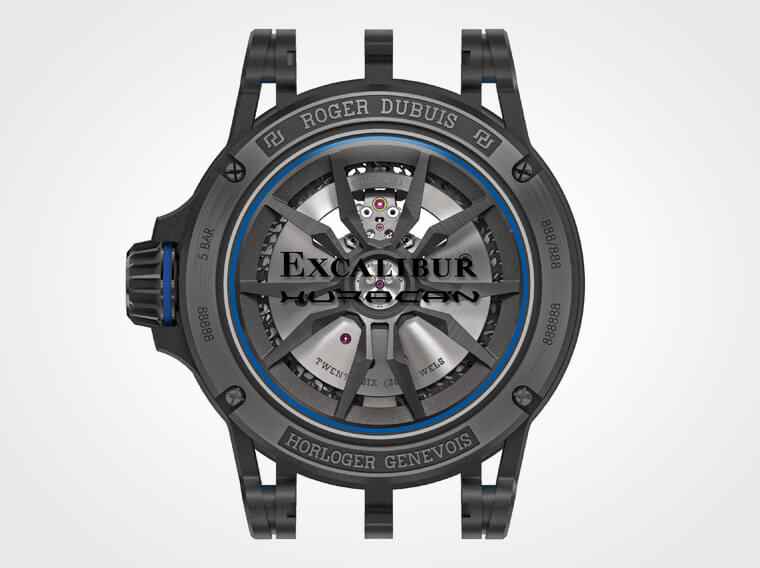 ▲此款手錶所搭載的機芯是羅杰杜彼與藍寶堅尼合作研發的第二款機芯。錶背的設計大量參考了Huracán的輪胎零件,包括輪圈與煞車碟盤結合自動盤能夠360度擺盪的特性。