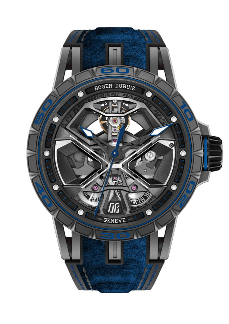 這款Excalibur Huracán鏤空自動上鍊手錶採用雙材質錶帶,黑色橡膠邊框以藍色縫線鑲接著藍色的阿爾坎塔拉(Alcantara®)面料,與錶圈以及面盤上的藍色刻度與指針等細節互相呼應;此外錶帶還配有可調節折疊式錶扣以及可確保迅速更換錶帶的快拆裝置,錶主可以隨心所欲搭配出自己想要的感覺。