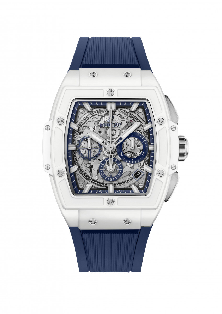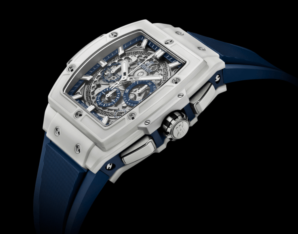 Spirit of Big Bang 洛磯山限量版計時碼錶採用品牌高辨識度的酒桶運動錶殼,針對滑雪愛好者,採用經典配色——象徵白雪皚皚的陶瓷錶殼與蔚藍天空的立體刻紋橡膠錶帶。高科技陶瓷因為具有高溫燒結的二氧化鋯,產生堅硬的錶殼,不僅耐刮痕且能降低長久佩戴所產生的痕跡,重量也比不鏽鋼材質輕。