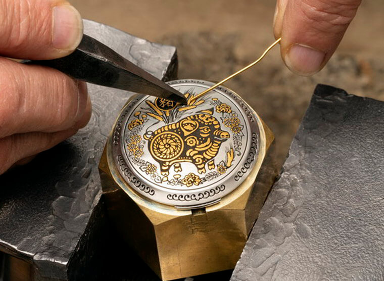 ▲近年來沛納的生肖錶往往都是採用義大利傳統的”Sparsello”金線嵌花工藝製作錶蓋的動物圖案。