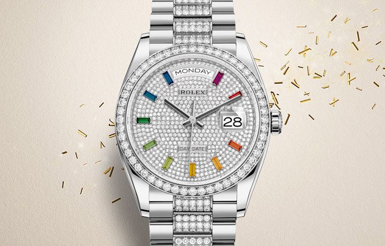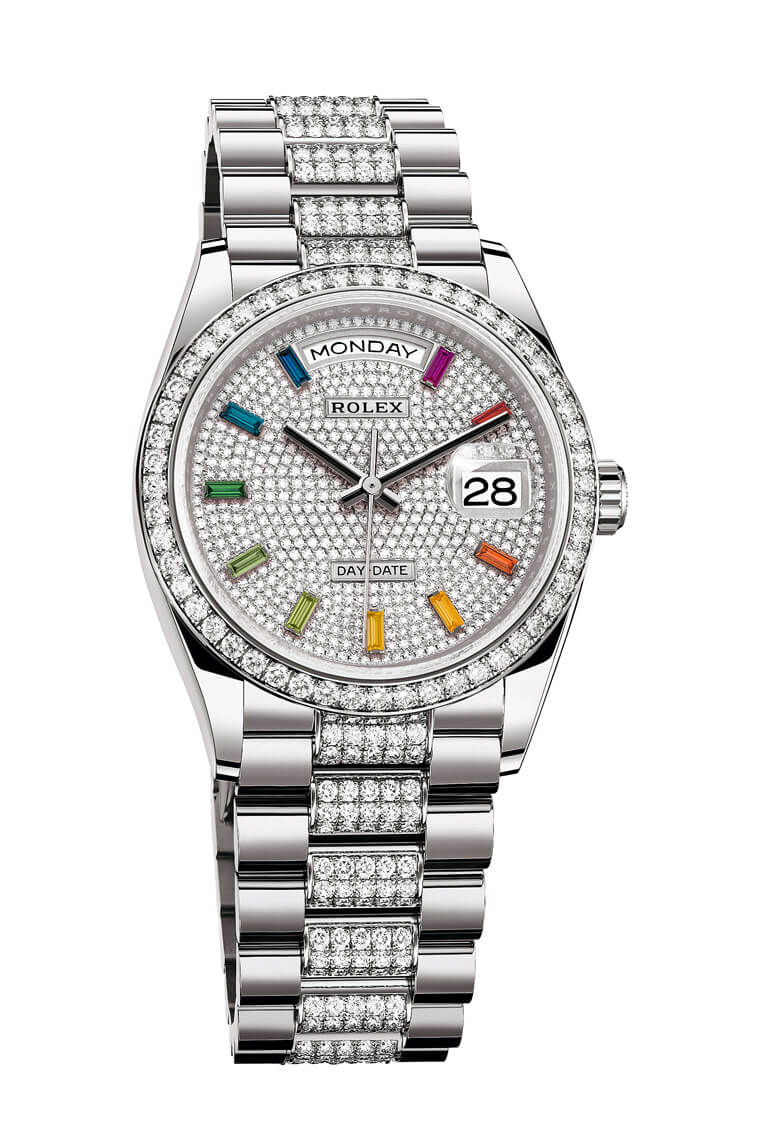 勞力士在1956年推出的Day-Date當時曾創下亮眼技術成就——例如它不僅專門使用金或鉑金這兩種貴金屬鑄造,更是世界上第一款在錶面上能同時顯示日期及星期全寫的手錶。這款錶因為曾被美國總統詹森在內的各國高官愛戴而博得「總統錶」的美名,雖然功能性並非勞力士旗下最複雜的,但是光靠它的歷史光環以及純用貴金屬製作錶殼的特性,讓這系列成為勞力士各系列中起價最高的旗艦級錶款之一。Day-Date系列在2019年進行了世代交替的改款,主要變化在於內搭機芯的版本升級,連帶勞力士也推出了數款新作(皆為36mm),系列主打的是黃金殼綠面款,但也還有128349RBR這款面盤、錶圈和鍊帶鑲了許多鑽石,同時時標也有寶石裝飾的新同學吸引人們關注。