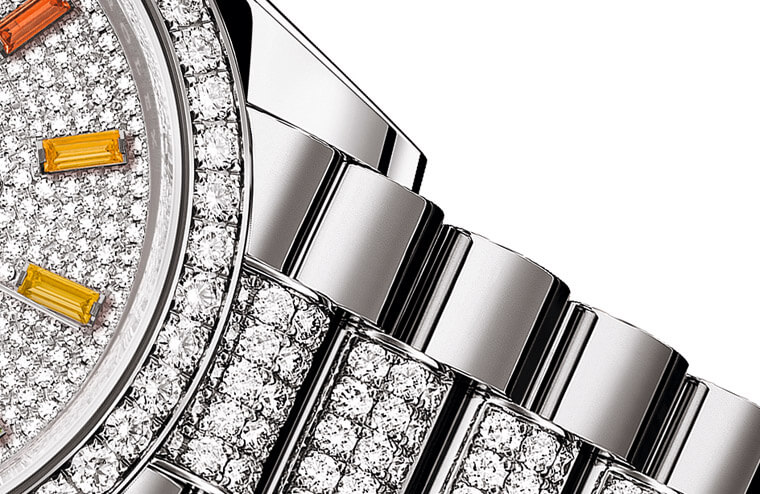 Day-Date目前就只剩36mm和40mm兩種尺寸,其中36mm的錶款有黃金、白金和永恆玫瑰金三種,40mm兩則多了一個鉑金錶殼可選,在勞力士各系列幾乎都有不鏽鋼款式的情況下顯得相當獨特又很尊貴,普遍來說,想要入手這個系列基本上都是百萬台幣起跳(包含沒有鑲鑽的款式),因此別看它就多了個星期顯示似乎沒有特別複雜,但是它的入手門檻可是比一般的勞高出一截,通常看到Day-Date會想要讚嘆一下是很合理的事。這款128349RBR採用的是白金材質,這在系列中算是稀鬆平常的配置,不過它比起系列其他36mm的款式比較不一樣的地方就是寶石的數量特別多,光是錶圈部分就鑲了52顆圓形鑽石,甚至鍊帶的中間鍊節也還有412顆圓鑽,戴在手上光芒耀眼並非浮誇的說法。