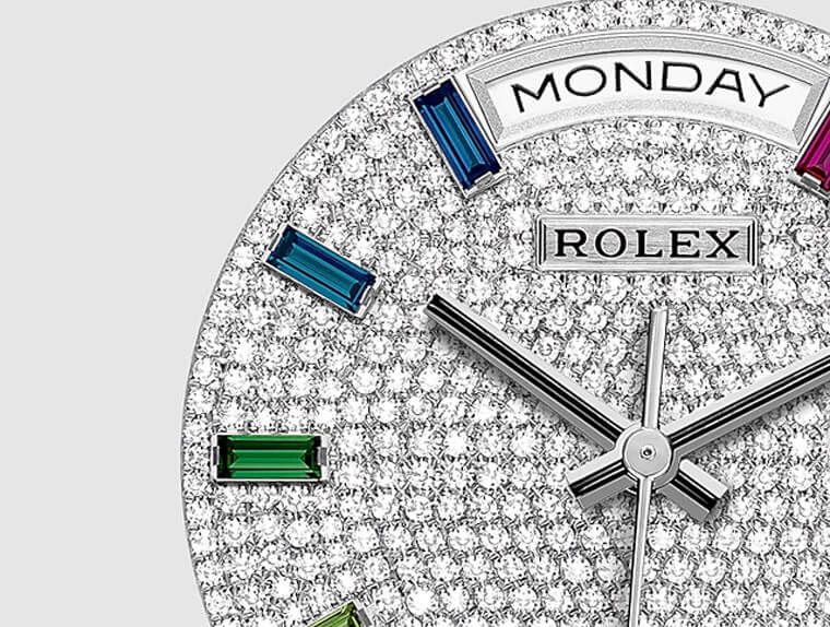 Day-Date採用貴金屬錶殼、上面鑲有鑽石這些特徵都還算系列常見特徵,不過這款不只是用鑲滿鑽石來吸引人而已,雖說它除了錶圈和鍊帶以外,在面盤上又還鑲了542顆鑽石,閃到讓人都快忘了要看時間,不過128349RBR特別吸引人的地方,恐怕還是在時標方面鑲上的10顆彩色寶石。36mm的Day-Date面盤格局一般來說可以分成三種:矩形時標、羅馬數字時標和寶石時標,最後一種又分成鑲鑽石或彩色寶石等款式,鑲嵌彩色寶石的Day-Date 36mm其實黃金、白金和永恆玫瑰金等三種材質都有,不過比起黃金或永恆玫瑰金,彩色寶石時標放在白金錶殼身上的效果更強烈,因為白金和鑽石的銀白色澤不僅不會搶了寶石的光彩,反而還能讓這些漸變色彩看起來更明顯,以實用性的角度而言,彩寶當作時標看上去一清二楚,以裝飾性的角度,比起全鑽的一片銀白,彩色寶石融入繽紛顏色也更能幫手錶的視覺效果加分。