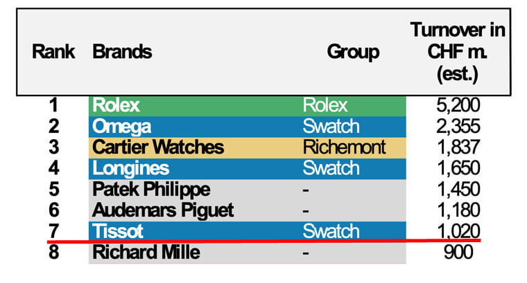 摩根史坦利提出的瑞士鐘錶業年度財報裡面含括許多資訊,礙於篇幅無法一一解讀,但我們從中挑了兩個重要的統計數據,讓大家更能具體感受到目前錶壇各品牌的發展現況——其一是銷售額排行、另一則是各品牌的銷售額佔比。