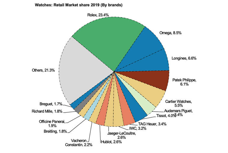 ▲瑞士錶壇2019年各品牌銷售額佔比。圖片:LuxeConsult, Morgan Stanley Research
