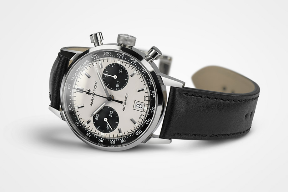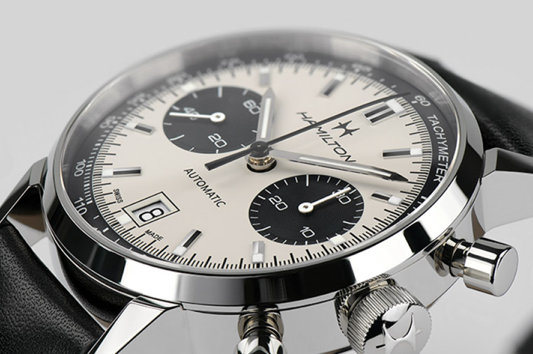 HAMILTON漢米爾頓於1968年推出兩款腕錶:Chronograph A搭配具備黑色小錶盤的白色面盤;Chronograh B的面盤則以黑色為背景,並具有兩個白色小錶盤,形成「倒錯熊貓」的格調。如此面盤設計在1960、1970年代相當流行,至今仍然魅力無減,深受大眾歡迎。腕錶別樹一格,黑白設計簡煉,現今收藏家都珍而重之。2017年品牌推出Intra-Matic 68 Auto Chrono腕錶,在保留原有特色之外,更將焦點集中於處理細節之上。面盤尤其忠於原作的「倒錯熊貓」面盤,外圈配備白色測速計刻度。黑白雙色形成腕錶主調,具有黑色背景的日期顯示、雪白的中置計時秒針、黑色漆面計時盤指針。