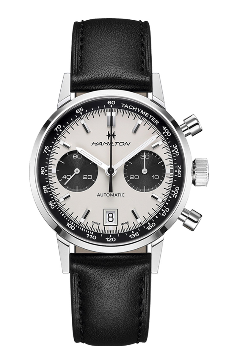 Intra-Matic 68 Auto Chrono腕錶仿傚擁有輝煌歷史的原作,在錶殼右側設有復古風格的按把,定必吸引漢米爾頓錶迷與收藏家。腕錶的拱形面盤、曲面指針,進一步展現整體的復古風格、傳承之感。黑色小牛皮錶帶經過裁邊處理,採用最傳統的手法製作,並精心打孔,再現1960年代的運動風格。