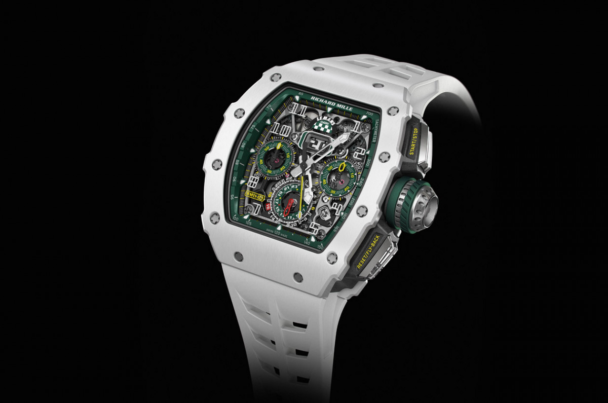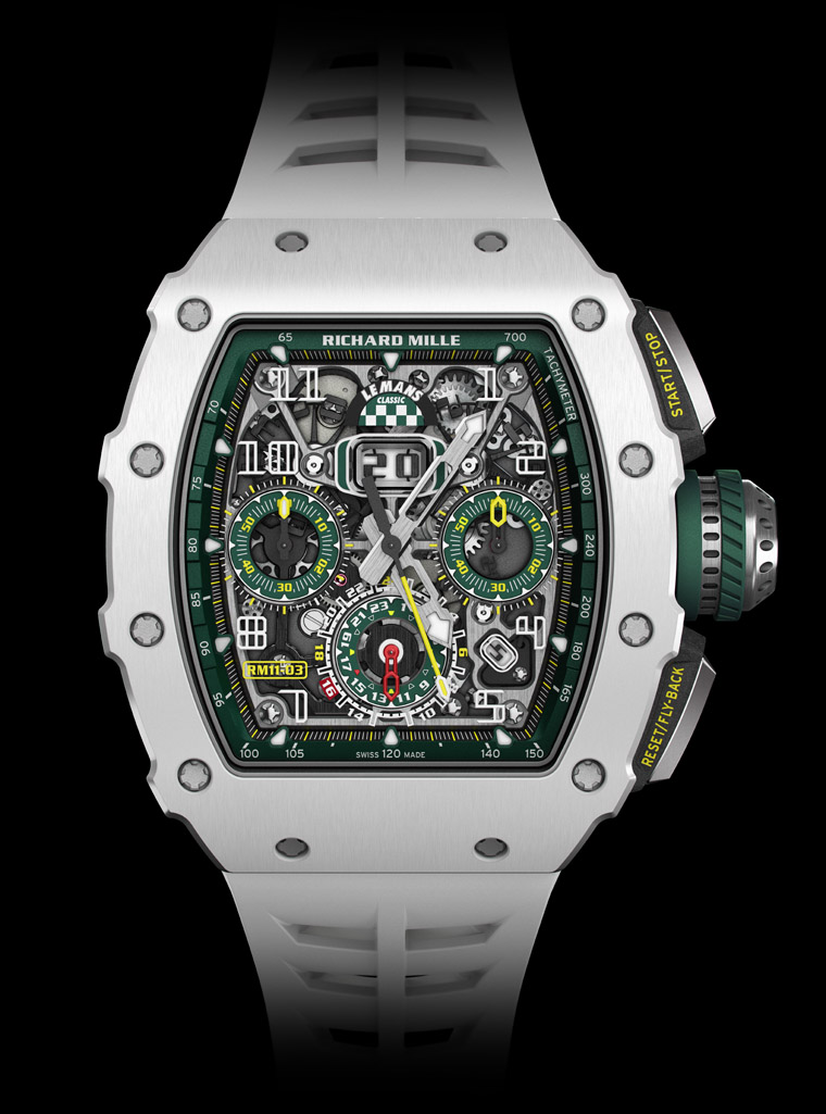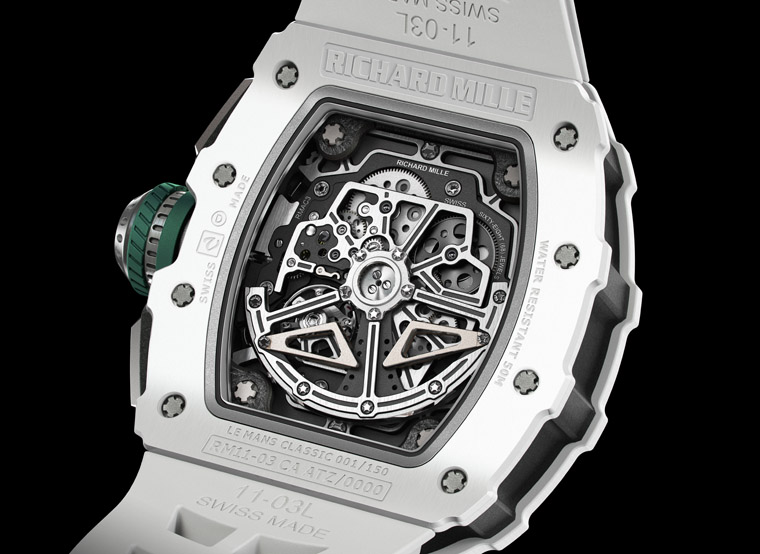 ▲RM 11-03 Le Mans Classic採用白色陶瓷材質,並搭配英國賽車綠色裝飾,連結起利曼經典車賽的印象,錶款搭載的RMAC3機芯具有可變幾何結構自動盤,設計靈感來自一級方程式賽車中的空氣動力部件,這種結構能夠根據佩戴者的活動劇烈程度調整腕錶的自動上鍊速度。